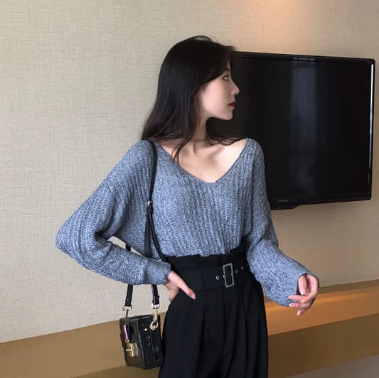 Knitted Solid Color Deep V-Neck Long Sleeve Sweater